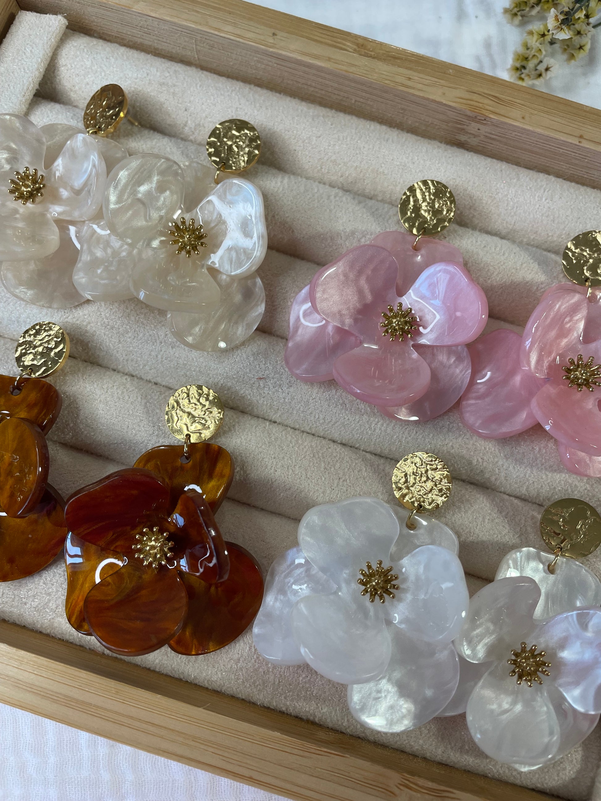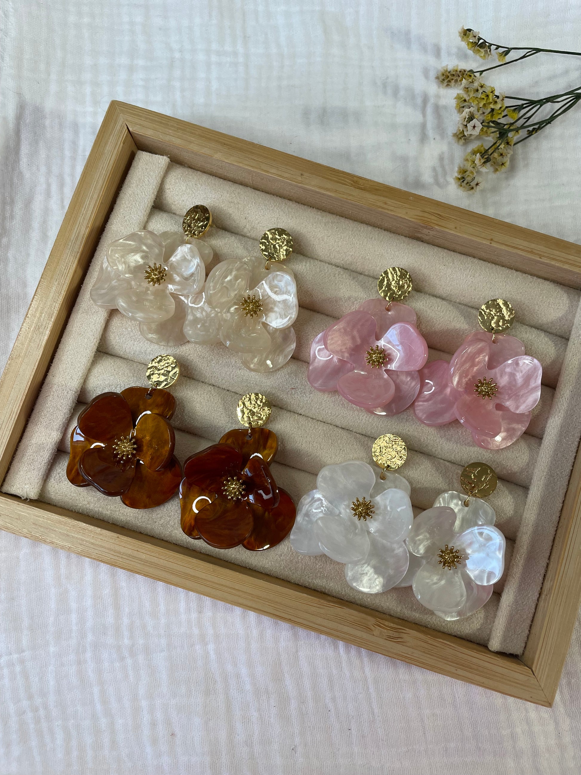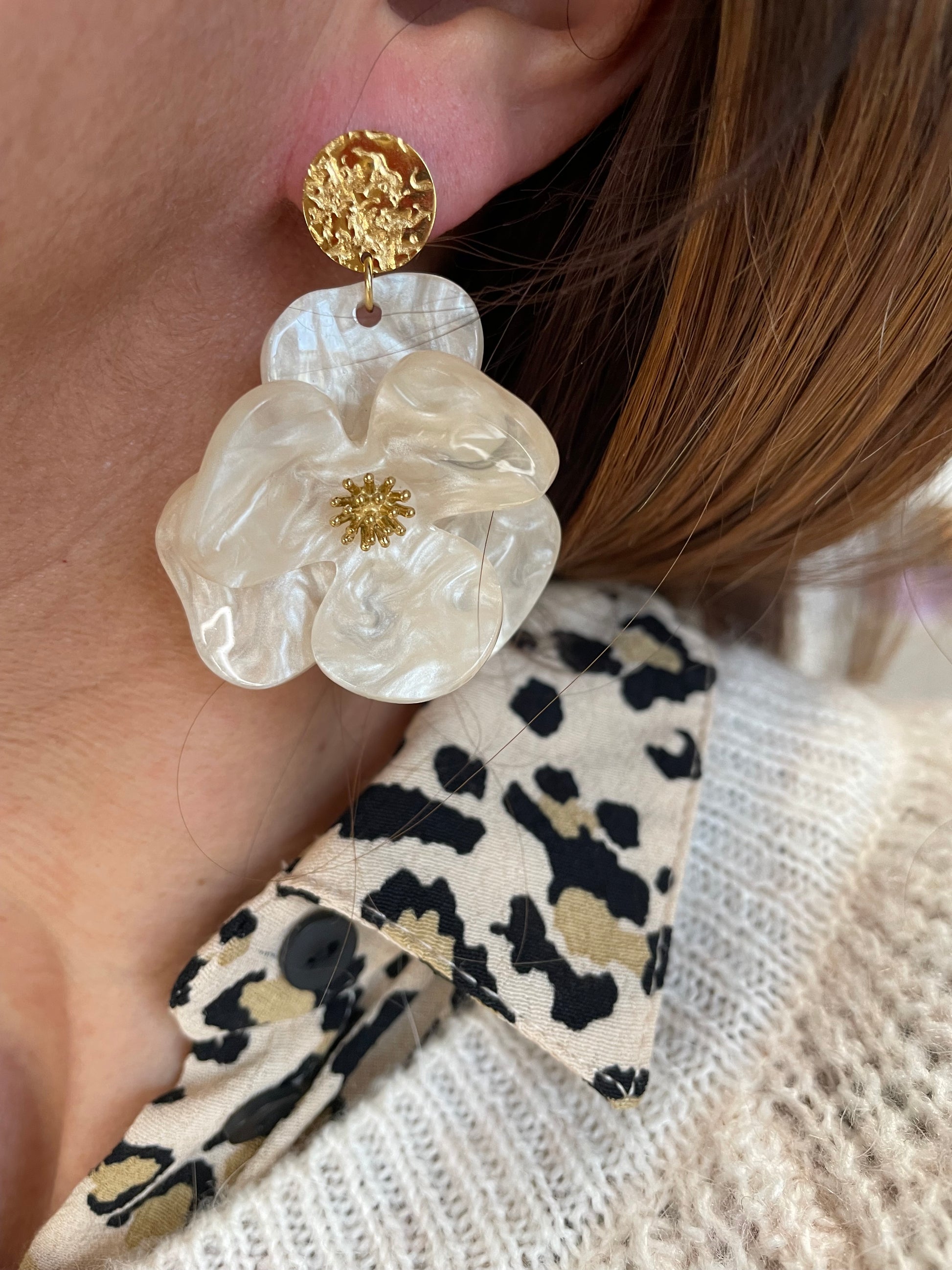 Maggie – Boucles d'oreilles Fleur Acrylique & Clou Doré Martelé