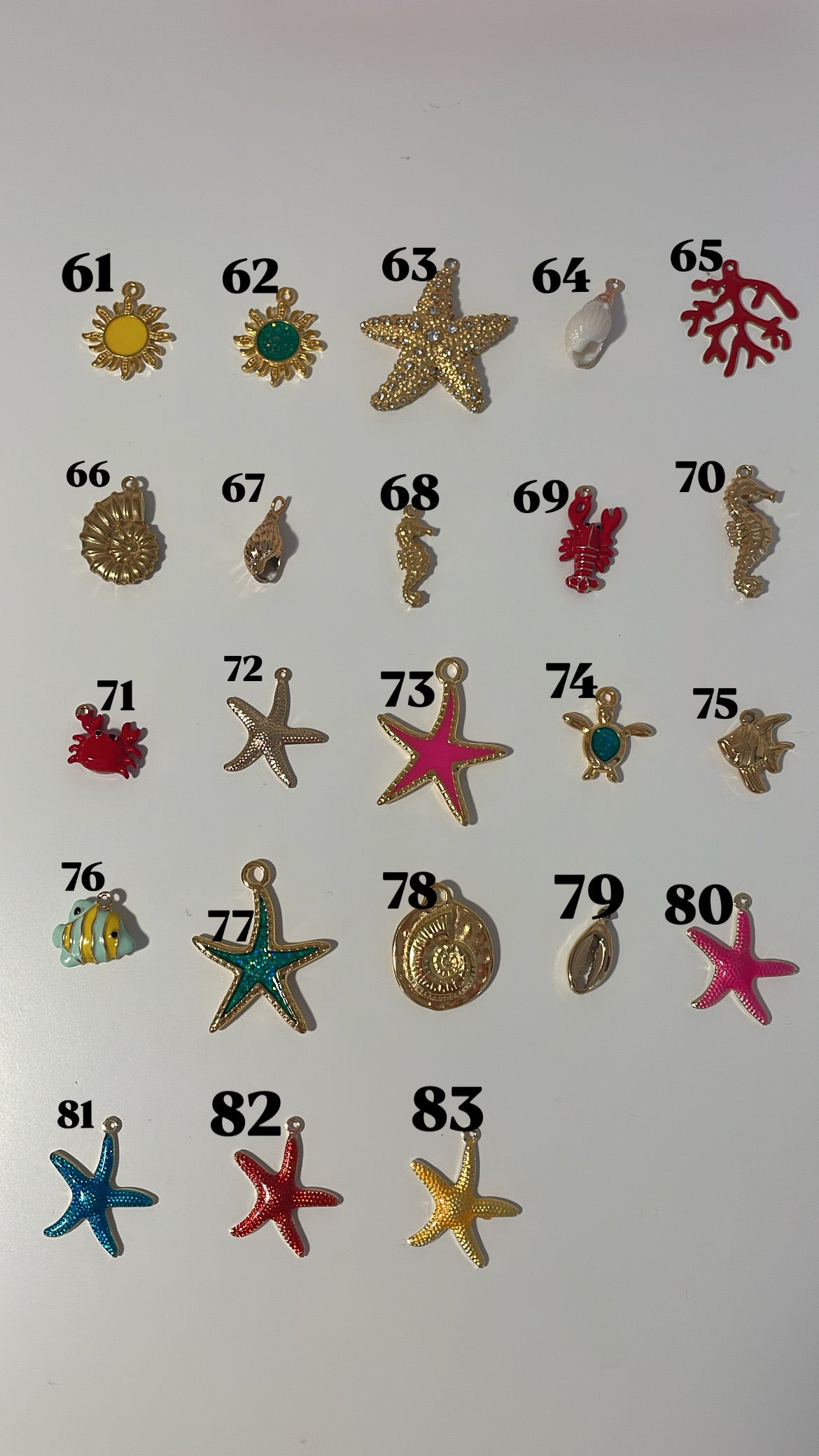 1- regardez les photos de charms ce dessus et notez les numéros de charms que vous souhaitez ( exemple je souhaite les charms : 5,26,99 et 2