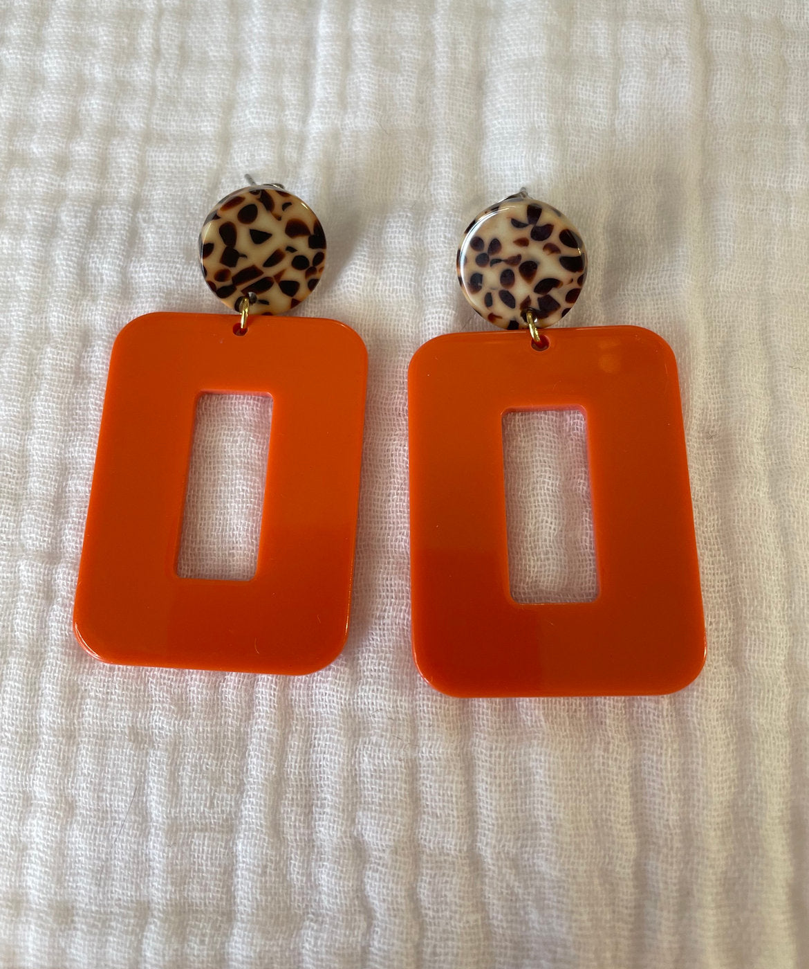 Rond tacheté marron et pendentif en acétate coloris terracotta.